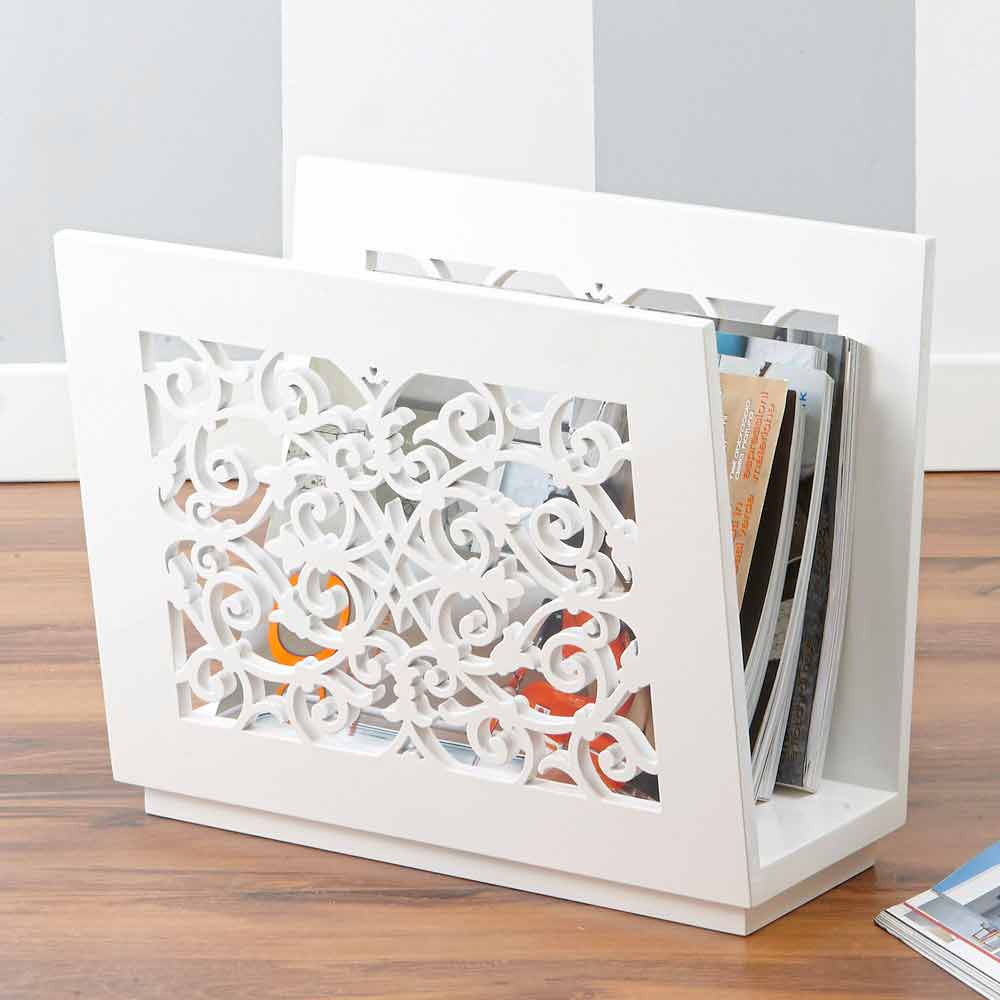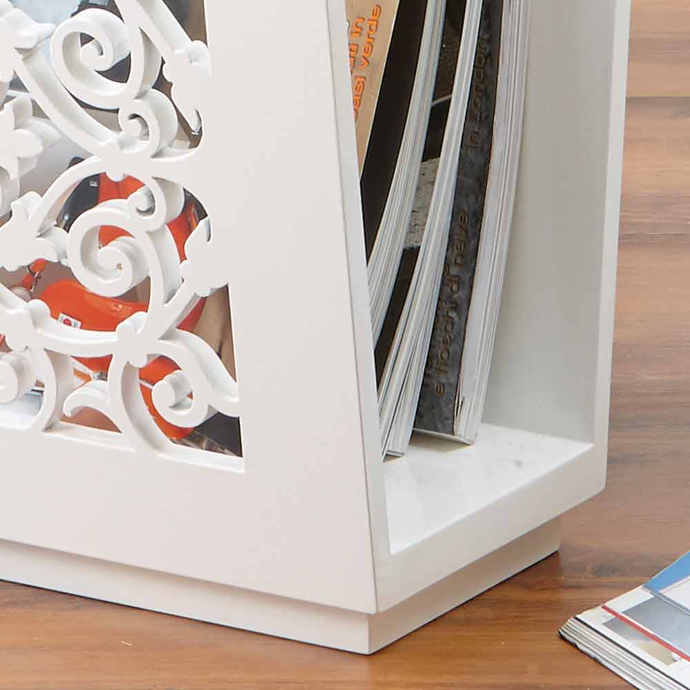 Porte-revues en bois blanc façonné, gravier, gris tourterelle, sable, design au sol moderne et élégant fabriqué en Italie.