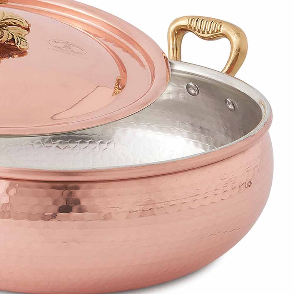 Légumier rond en cuivre martelé avec anses et couvercle, fabrication artisanale italienne.
