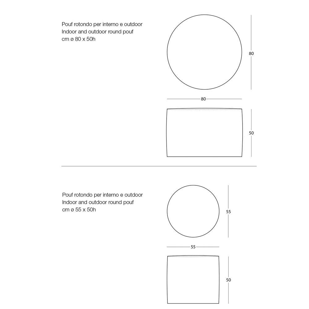 Pouf pouf rond pour usage intérieur ou extérieur en fibre polyester bleu, gris tourterelle ou chanvre, article de qualité fabriqué en Italie.