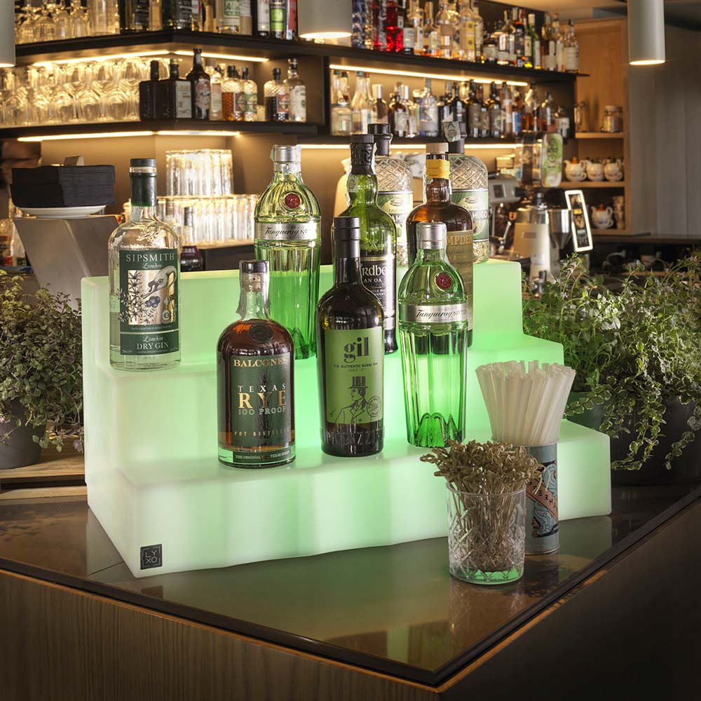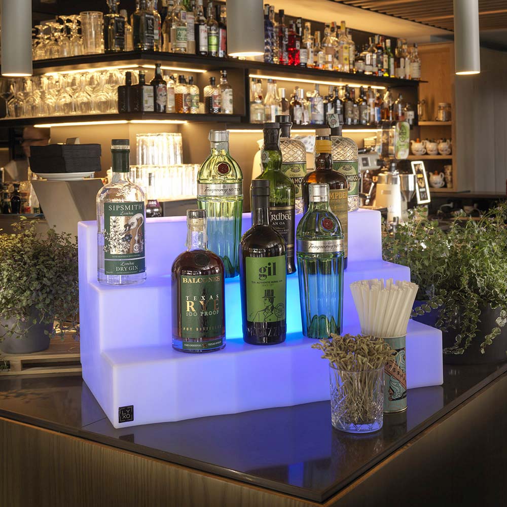 Présentoir à bouteilles Marvy en polyéthylène composé de trois grandes marches qui permettent d'accueillir différents types de bouteilles afin de rendre l'espace bar élégant et moderne avec une touche de design italien classique . Écran qui s'éclaire avec l'option de lumière LED blanche ou LED RGBW , à votre discrétion. Une solution à grand impact visuel, esthétique mais aussi fonctionnelle.