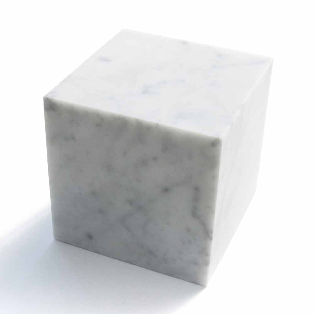 Presse-papier cube en marbre blanc de Carrare . C'est une pièce unique car chaque bloc de marbre utilisé diffère des autres pour les veines et les nuances grâce au savoir-faire de professionnels spécialisés dans le traitement du marbre.