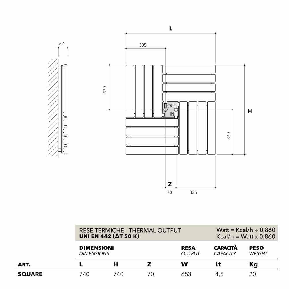 Caractéristiques techniques: - Vanne, porte-bouclier et raccords hydrauliques à l'intérieur du radiateur, cachés par le bac humidificateur - Pression maximale de fonctionnement : 5 bars - Non disponible pour les systèmes monotube