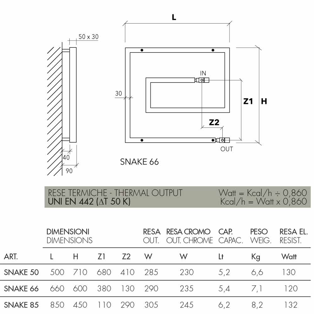 Dimensions L.660 mm, H.600 mm, entraxe1 380 mm, entraxe2 130 mm, rendement thermique 290 watts, capacité 5,4 lt, poids 7,1 kg