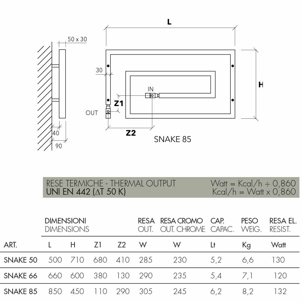 | Dimensions | L.850 mm, H.450 mm, entraxe1 110 mm, entraxe2 290 mm, puissance thermique 245 watts, capacité 6,2 lt, poids 8,2 kg |