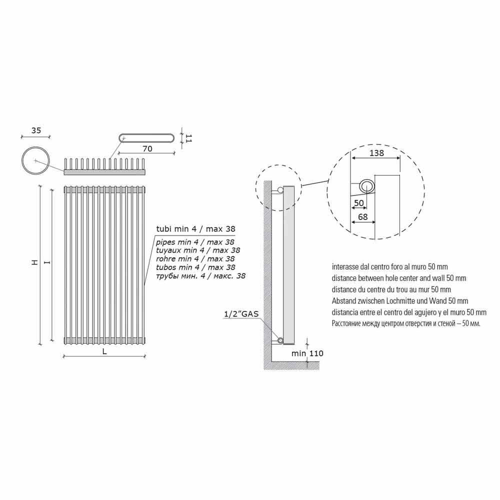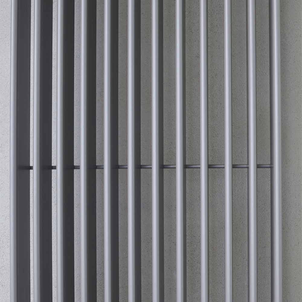de tubes plats verticaux de 70 x 11 mm soudés perpendiculairement aux collecteurs de 35 mm de diamètre, pour un design minimal et moderne.
