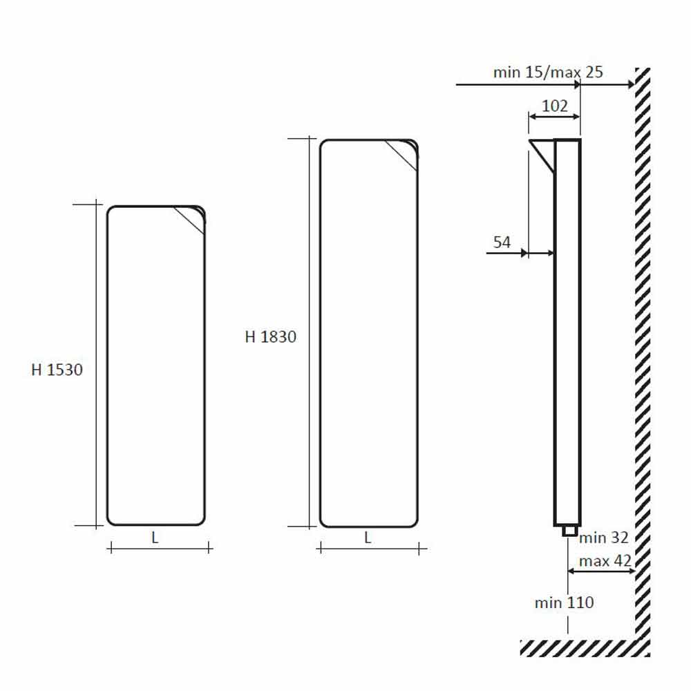 - H 1530 x L 375 x Inter. 50 x P 48 mm x Sortie w (Δt50 °) 385; Rendement w (At30 °) 197; Rendement w (Δt26 °) 166