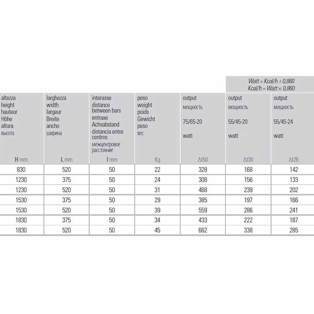 - H 1830 x L 520 x Inter. 50 x P 48 mm x Sortie w (Δt50 °) 662; Rendement w (Δt30 °) 338; Rendement w (Δt26 °) 285