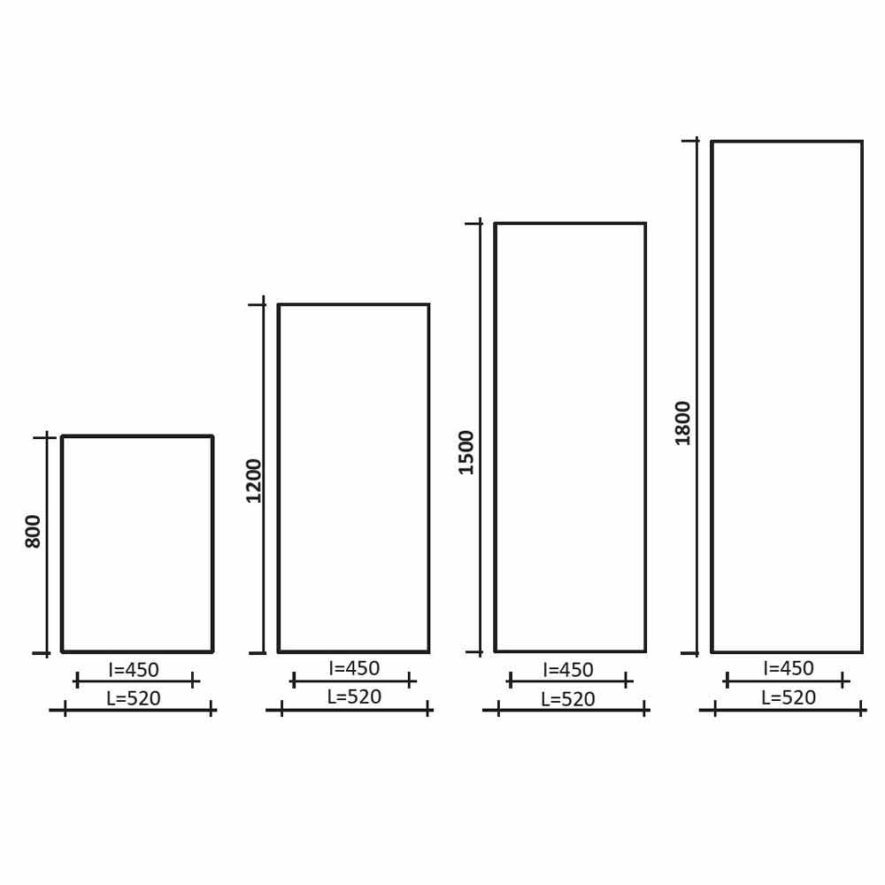 Disponible en différentes tailles *:- H 800 x L 520 x Inter. 450 x P 65 mm x Sortie w (Δt50 °) 450; Rendement w (Δt30 °) 230; Rendement w (Δt26 °) 195