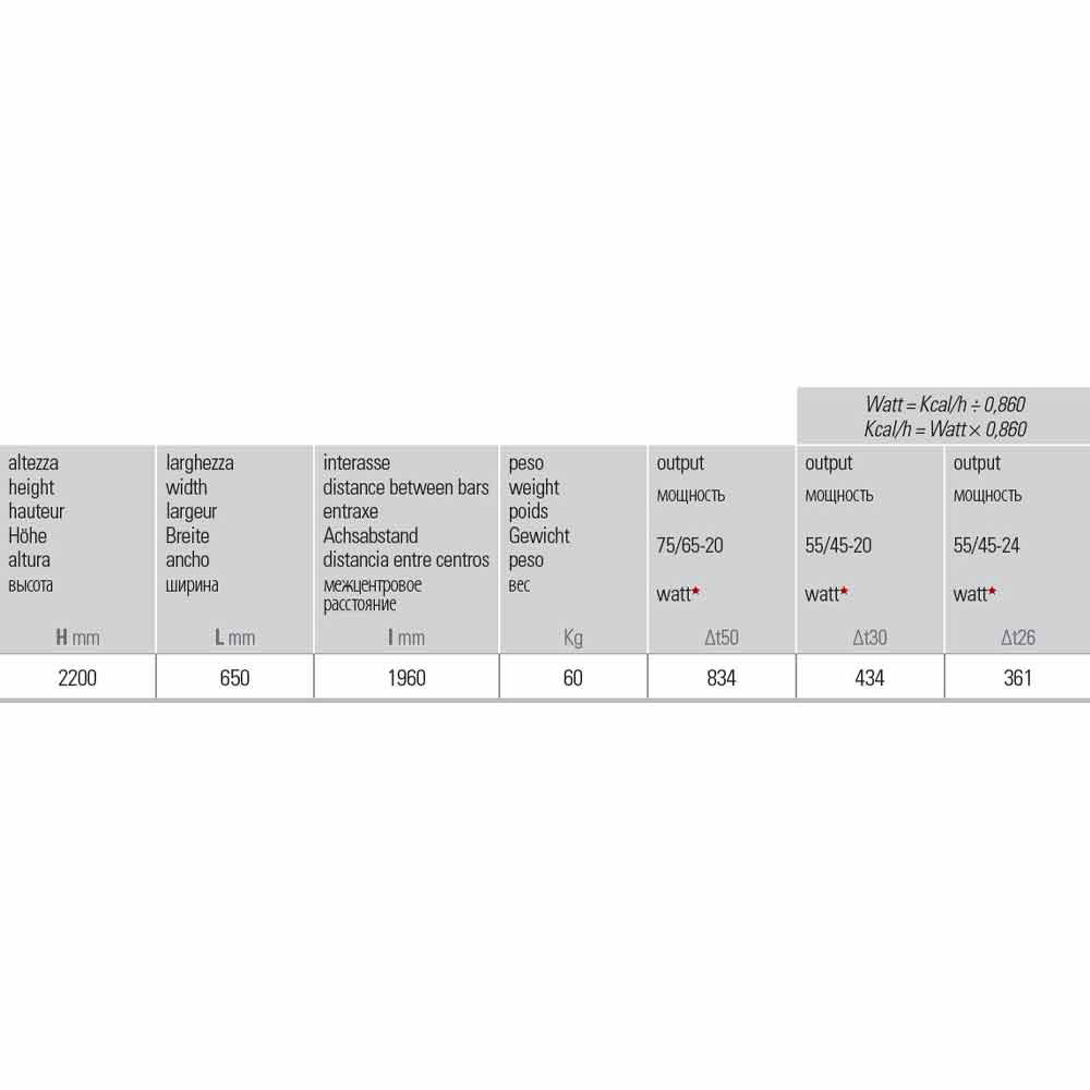 Taille: H 2200 x L 650 x Inter. 1960 mm x Sortie Δt50 834 W, Δt30 434 W, Δt26 631 W