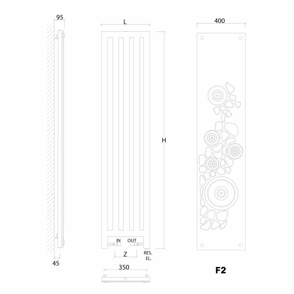 | Dimensions | L.400 mm, H.1800 mm, P.85 mm, entraxe 172 mm, résistance électrique 600 Watt, capacité 10,2 Lt, poids 29,5 Kg |