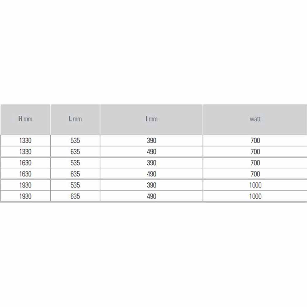 - H 1820 x L 535 x Inter. 460 x P 63 mm x Rendement w 1000;
