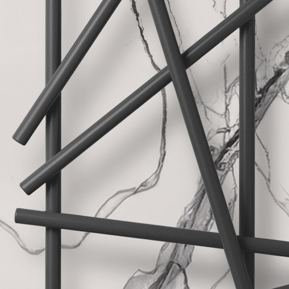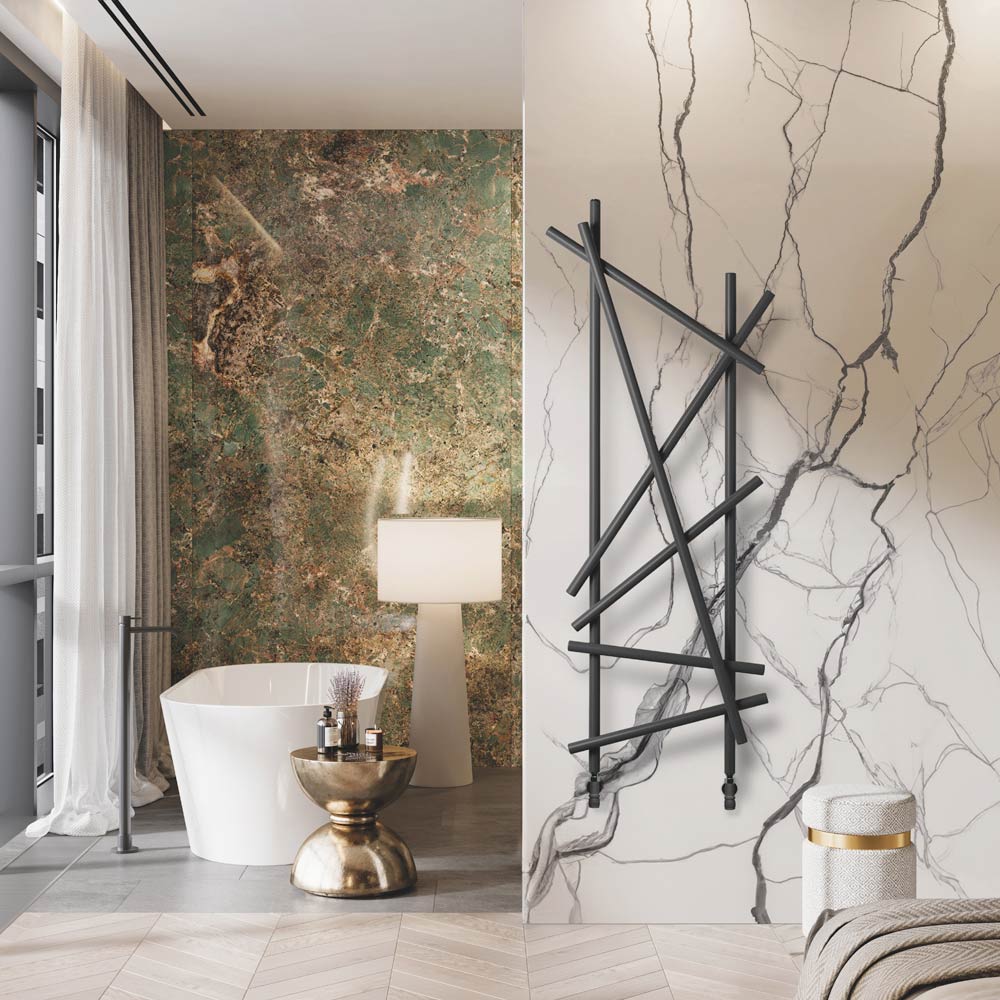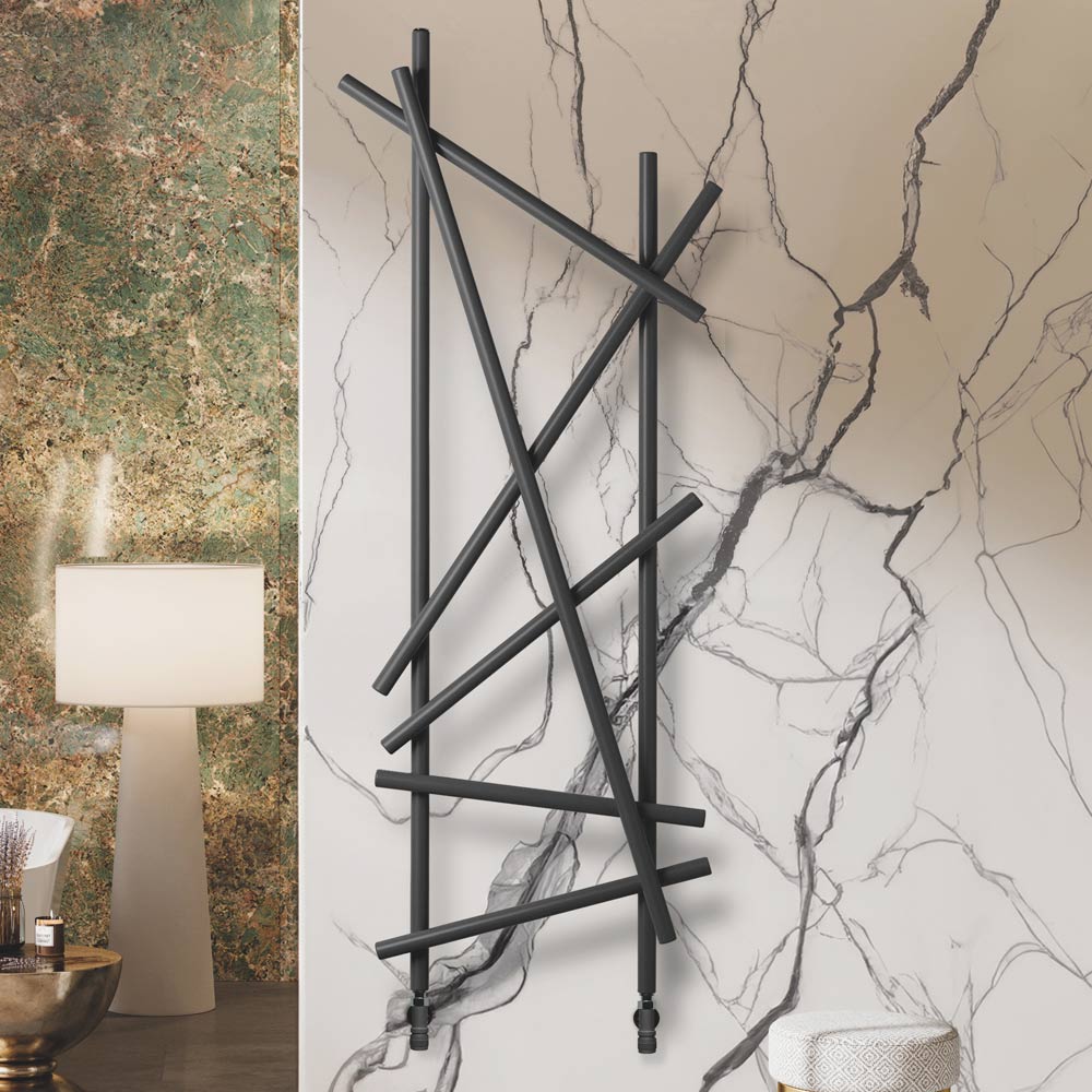 Ce radiateur en acier se distingue par son design innovant et artistique, idéal pour ceux qui recherchent un élément fonctionnel à fort impact esthétique pour leur environnement. Les lignes irrégulières et croisées maximisent non seulement la diffusion de la chaleur mais transforment également le radiateur en une véritable œuvre d'art murale. La finition noire mate donne une touche de modernité et de classe, s'intégrant parfaitement à n'importe quelle palette de couleurs et à n'importe quel design intérieur, comme le démontrent les élégants murs en marbre et les accents métalliques de l'environnement environnant.