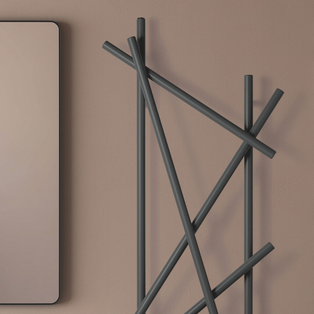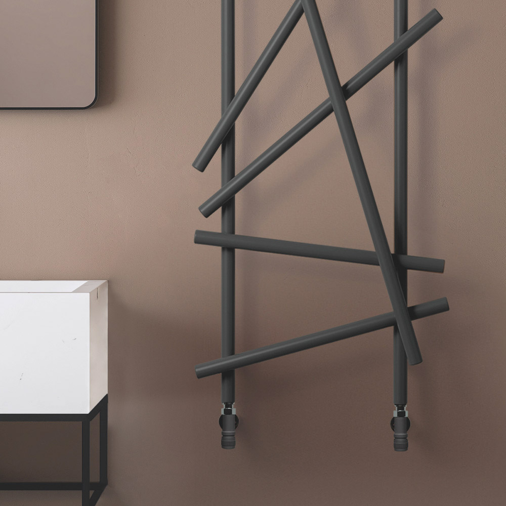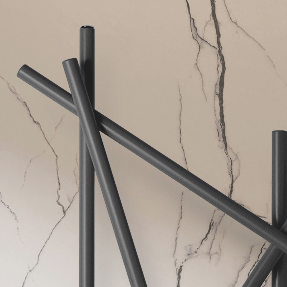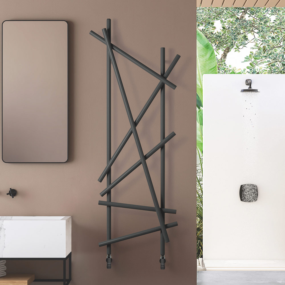Ce radiateur en acier se distingue par son design innovant et artistique, idéal pour ceux qui recherchent un élément fonctionnel à fort impact esthétique pour leur environnement. Les lignes irrégulières et croisées maximisent non seulement la diffusion de la chaleur mais transforment également le radiateur en une véritable œuvre d'art murale. La finition noire mate donne une touche de modernité et de classe, s'intégrant parfaitement à n'importe quelle palette de couleurs et à n'importe quel design intérieur, comme le démontrent les élégants murs en marbre et les accents métalliques de l'environnement environnant.