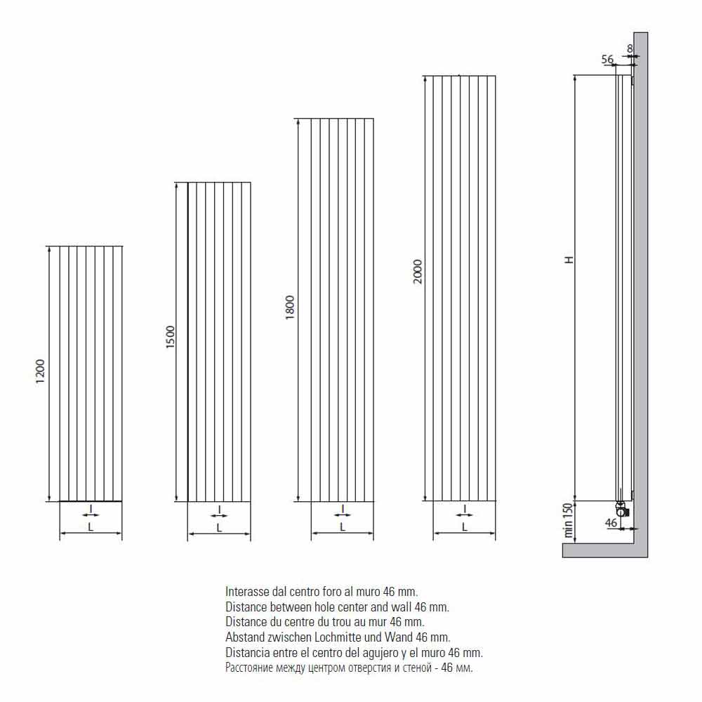 Disponible en différentes tailles *:- H 1200 x L 293 x Inter. 50 mm x Sortie w (Δt50 *) 420; Rendement w (At30 *) 215; Rendement w (Δ26 *) 182;