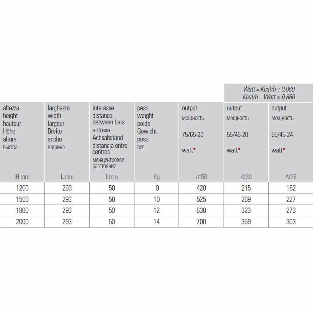 - H 1800 x L 293 x Inter. 50 mm x Rendement w (Δt50 *) 630; Rendement w (Δt30 *) 323; Rendement w (Δ26 *) 273;