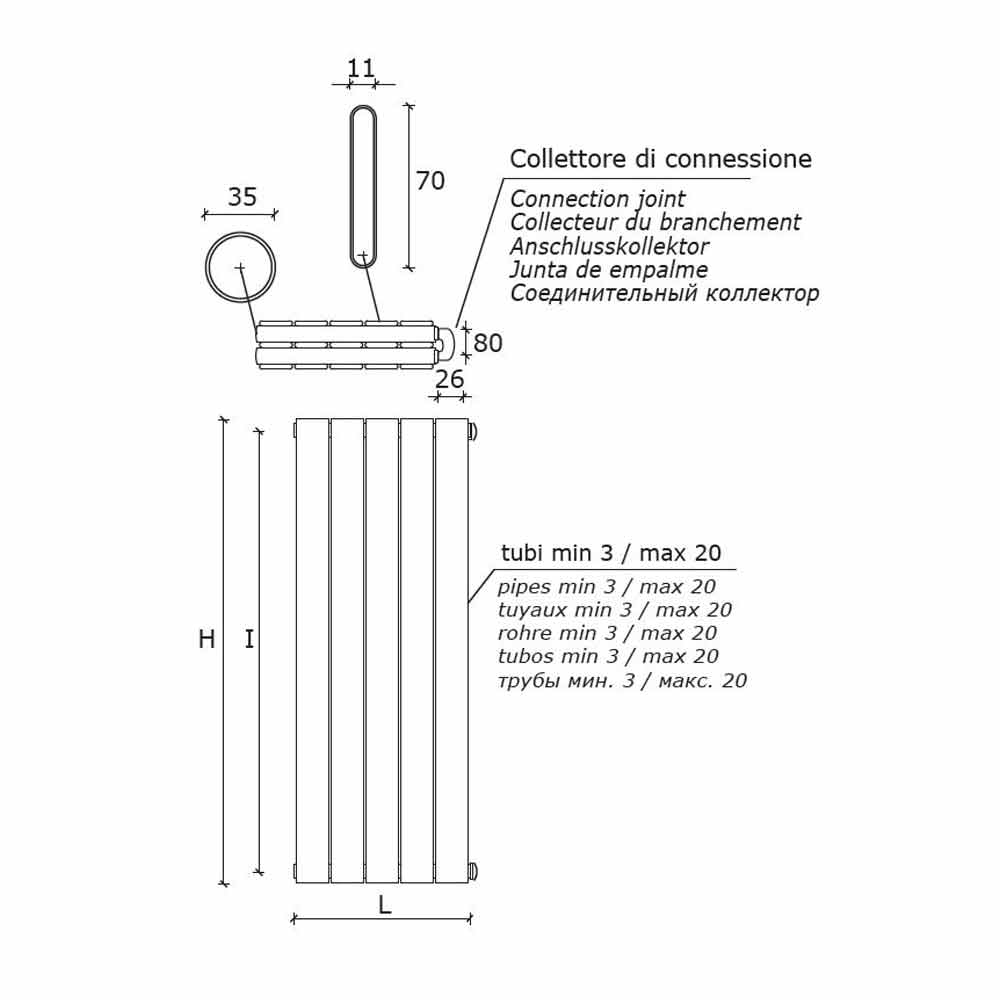 Ce radiateur présente une conception composée de tubes plats verticaux de 70x11 mm et de collecteurs de 35 mm de diamètre. C'est un radiateur en acier au carbone adapté aux environnements contemporains, entièrement fabriqué en Italie, la valeur du radiateur est déterminée par des valeurs telles que la qualité totale, le service du plus haut niveau, la recherche d'un design toujours innovant mais fonctionnel et le respect de l'environnement. non seulement dans le développement de produits à faible impact environnemental, mais aussi dans la phase de production.