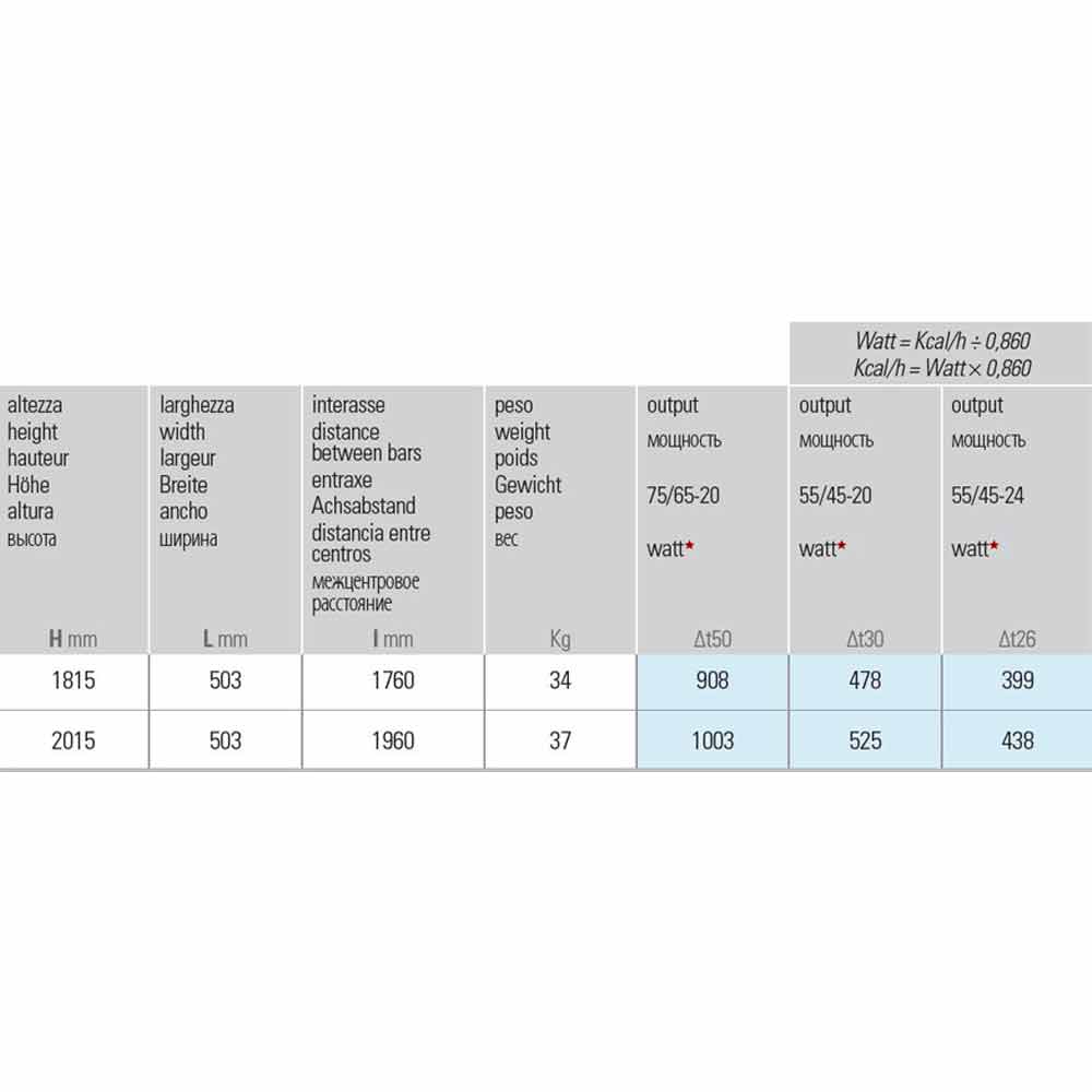 - H 2015 x L 503 x Inter. 1960 mm x Rendement w (Δt50 *) 1003; Rendement w (Δt30 *) 525; Rendement w (Δt26 *) 438