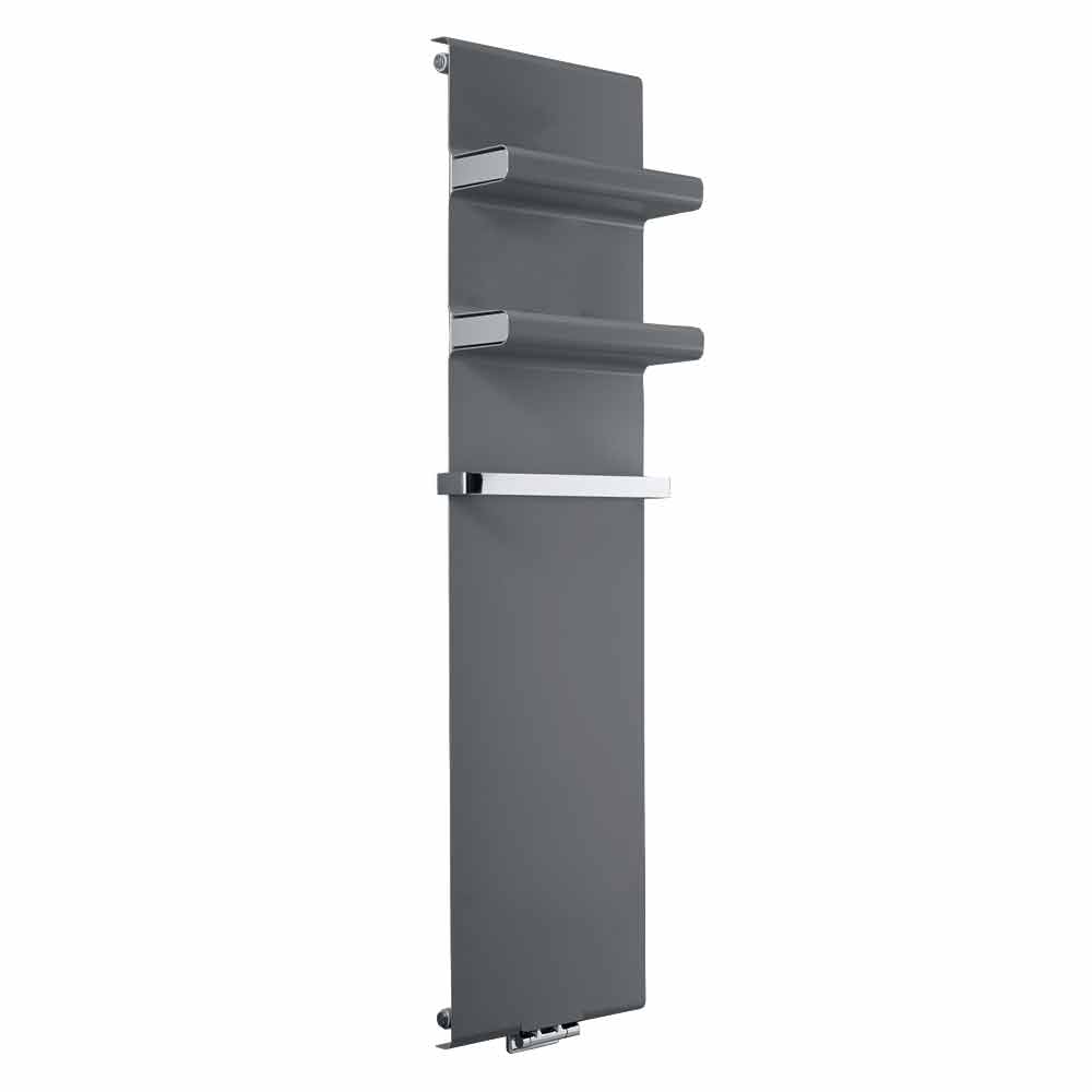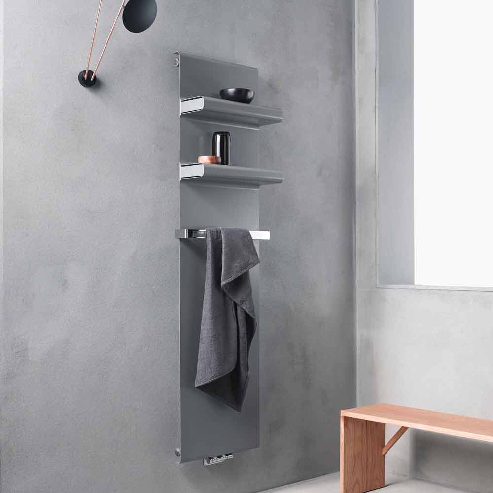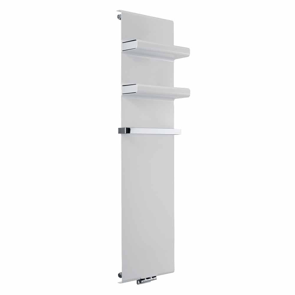 plaque radiante hydraulique présente un design moderne et minimal avec des étagères intégrées pratiques et élégantes avec couvercle inclus et un porte-serviettes chromé, qui prolonge la largeur du radiateur de 4 cm.