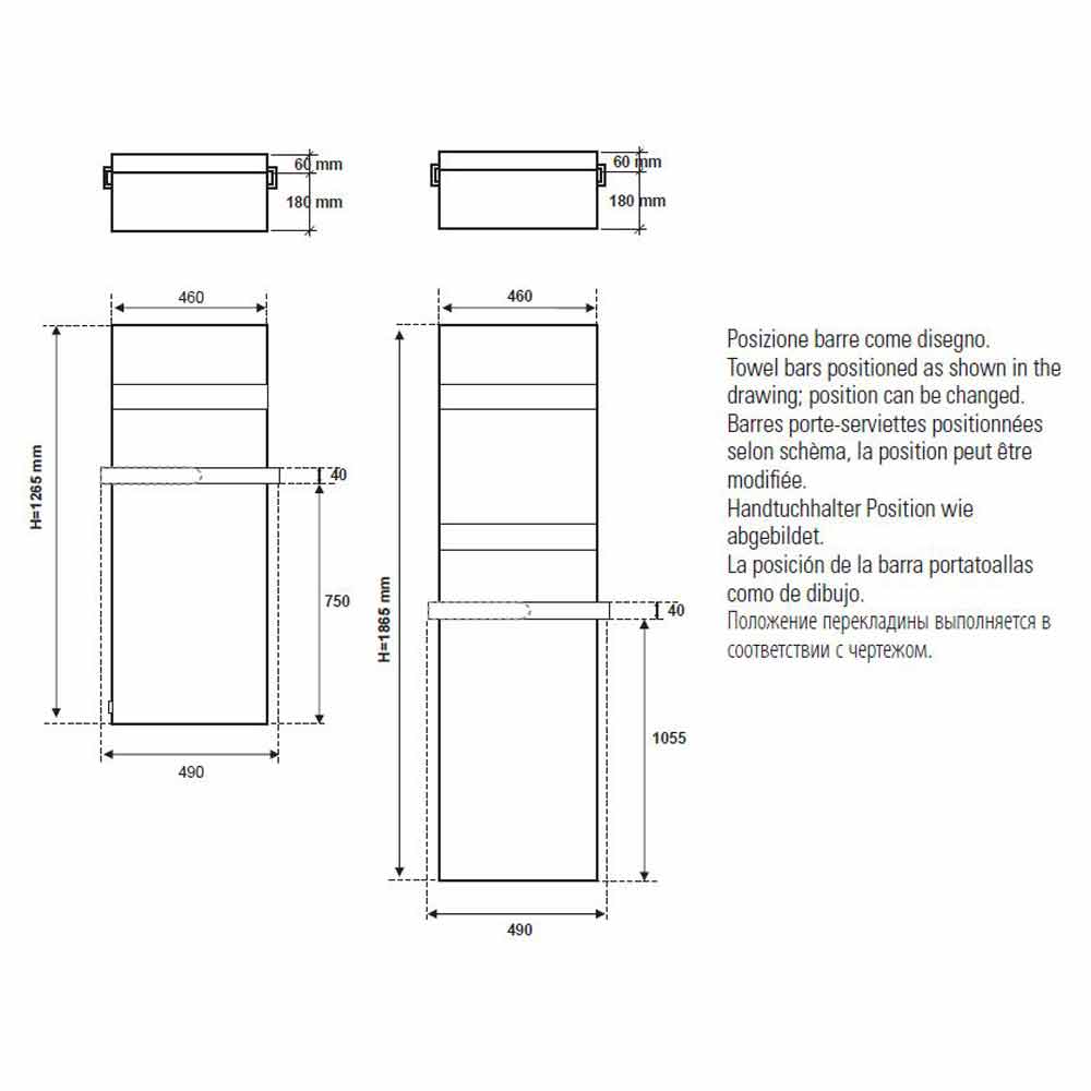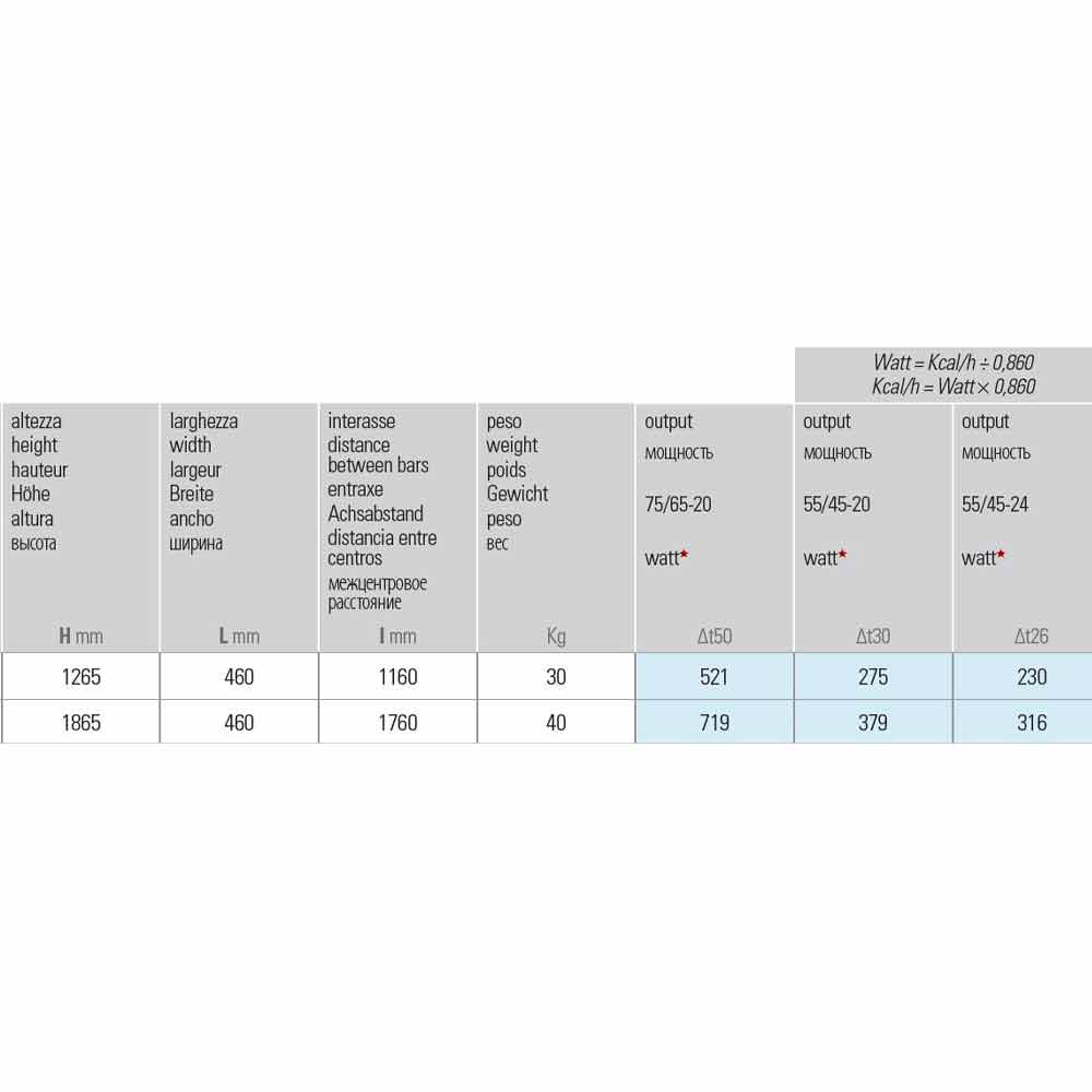 - H 1865 x L 460 x Inter. 1760 mm x Rendement w (Δt50 *) 719; Rendement w (At30 *) 379; Sortie w (Δt26 *) 316 (2 étagères).