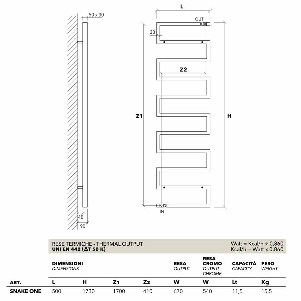 | Dimensions | L.500 mm, H.1730 mm, Empattement1 1700 mm, Empattement2 410 mm, Puissance calorifique 540 Watt, Capacité 11,5 Lt, Poids 15,5 Kg |