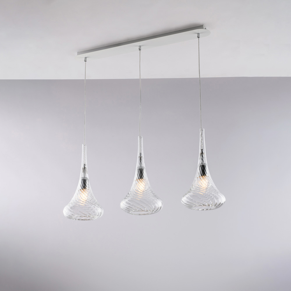 Épurée et élégante, cette suspension artisanale en fer forgé et verre Pyrex est une solution d'éclairage contemporaine, idéale pour ceux qui recherchent un équilibre entre fonctionnalité et esthétique. Les trois diffuseurs en verre Pyrex , aux formes douces et légèrement évasées, sont suspendus le long d'un rail horizontal, assurant une diffusion homogène de la lumière et un effet visuel harmonieux.