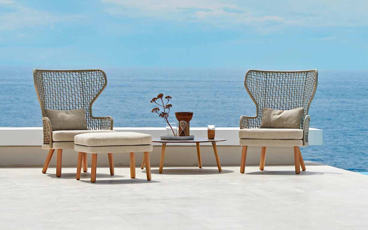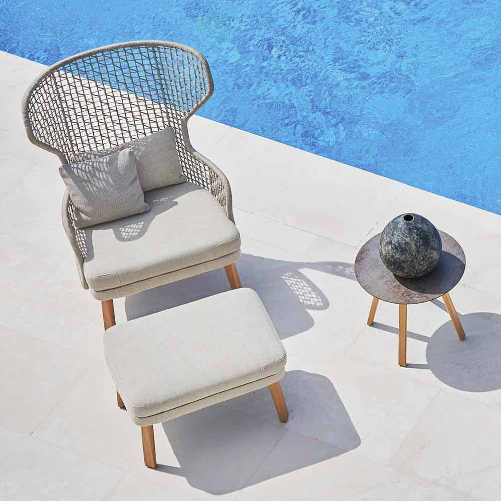 Emma est un repose-pied de jardin enchanteur caractérisé par une solide structure en bois d'iroko et un siège rembourré en caoutchouc Dryfeel recouvert de tissu.