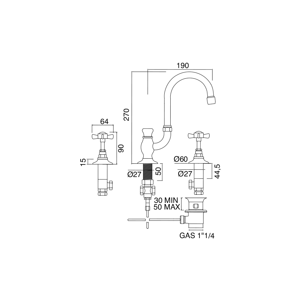 Katerina est un robinet de lavabo à bec haut raffiné, trois trous et vidange.