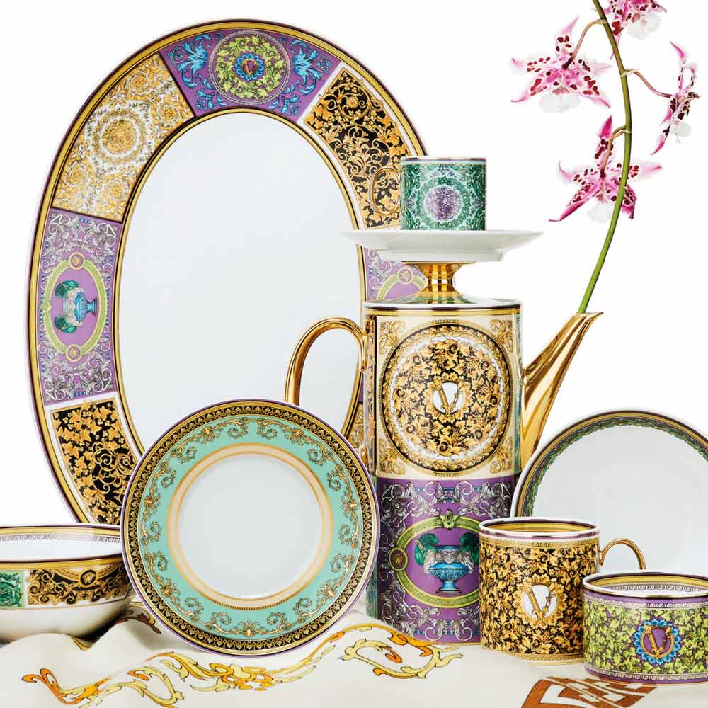Ce mug Barocco Mosaic de Versace , fabriqué en porcelaine fine , représente l'équilibre parfait entre l'élégance classique et le style contemporain. Son design exclusif associe des motifs baroques dorés au symbole emblématique de la Méduse , enrichi de détails complexes et d'une palette de couleurs raffinée qui reflète le luxe intemporel de la maison.