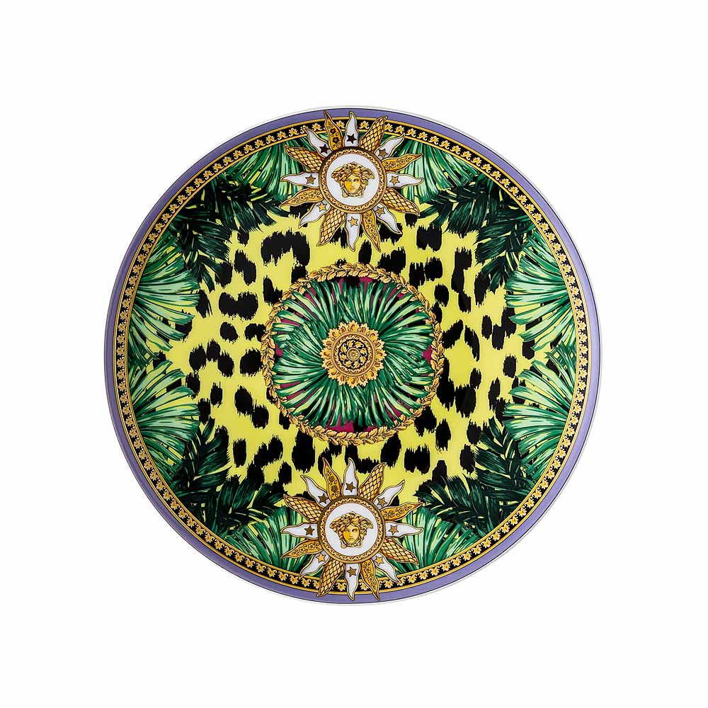 L' assiette à pain Versace Jungle Animalier , réalisée en porcelaine fine , est une explosion de vitalité et de luxe exotique . Son design audacieux présente un fond vibrant décoré de motifs de feuilles tropicales et de détails animaliers, le tout rehaussé par le symbole emblématique de la Méduse placé dans un soleil doré, symbole d'énergie et de puissance.