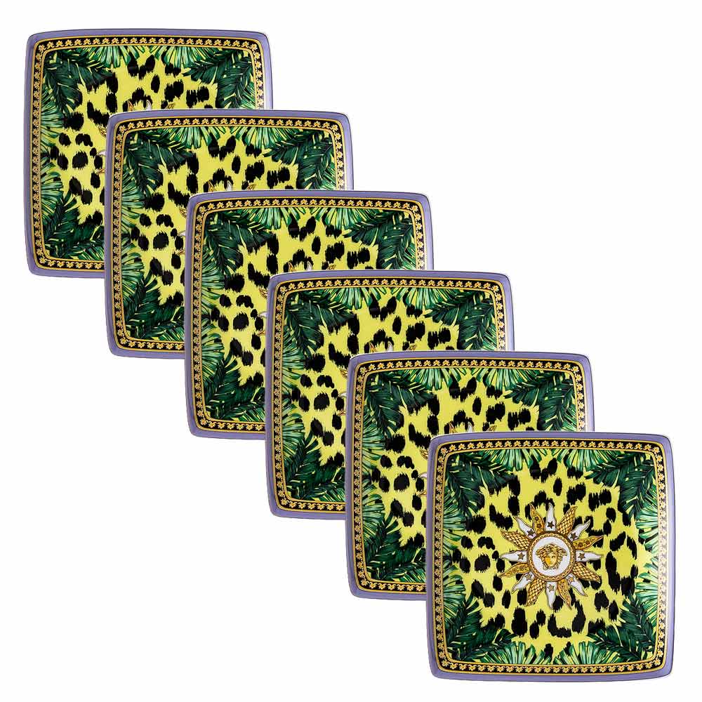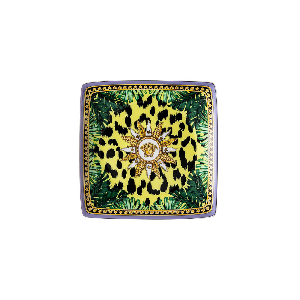 La tasse Jungle Animalier de Versace , fabriquée en porcelaine fine , est une explosion de style et de luxe sauvage . Son design accrocheur associe un motif animalier vibrant sur un fond jaune, encadré de feuilles tropicales luxuriantes et dominé par le symbole emblématique de la Méduse , serti dans un soleil doré et agrémenté de détails baroques.