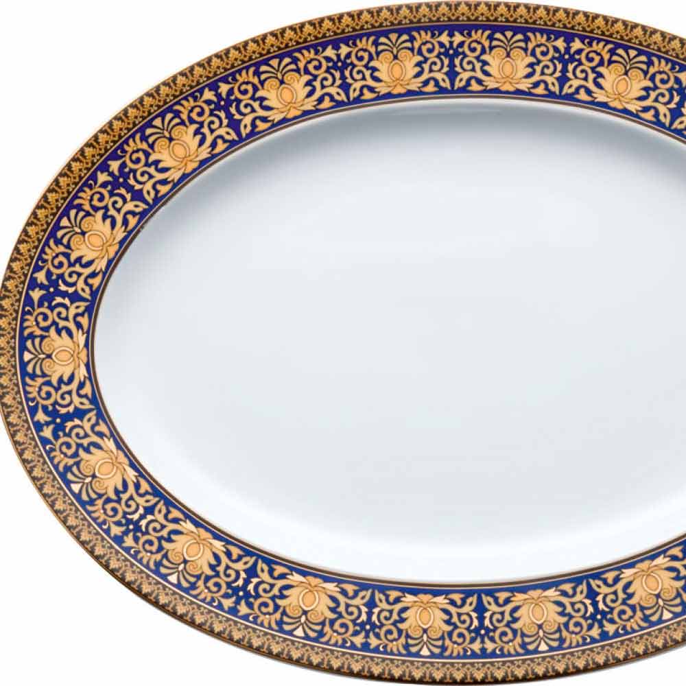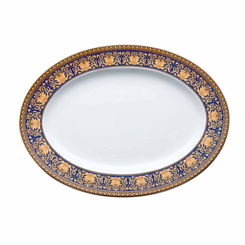 Assiette ovale en porcelaine design Medusa Blue de Rosenthal Versace L'assiette ovale fantastique et moderne de 34x24,5 cm conçue par Versace fait partie de l'élégante collection moderne qui, associée à un glamour fascinant et raffiné, rappelle les époques passées et s'exprime dans la nuance lumineuse du bleu et prend le nom de Medusa Blue. Avec Medusa Blue, un classique de la Maison s'habille de nouvelles couleurs contemporaines. La tête de Méduse est l'icône de la collection Versace qui en fait un service classique mais en même temps un symbole de luxe dans la table contemporaine. NB. Ne pas laver au lave-vaisselle, laver à la main !