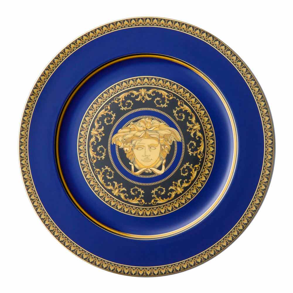 Assiette de présentation Medusa Blue Design de Rosenthal Versace en porcelaine L'assiette marque-place en porcelaine 30 cm de Versace fait partie de l'élégante collection moderne qui, associée à un glamour fascinant et raffiné, rappelle les époques passées, exprimées dans la nuance de bleu vif et prend le nom de Medusa Blue. Avec Medusa Blue, un classique de la Maison s'habille de nouvelles couleurs contemporaines. La tête de Méduse est l'icône de la collection Versace qui en fait un service classique mais en même temps un symbole de luxe dans la table contemporaine. NB. Ne pas laver au lave-vaisselle, laver à la main !