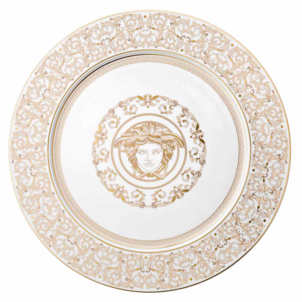Assiette de service Medusa Gala 33 cm en porcelaine Rosenthal Versace La fabuleuse assiette porte-cartes de 33 cm de Versace fait partie de la collection de table raffinée et luxueuse Medusa Gala. Inspirée par l'opulence et l'atmosphère unique des dîners de gala, Medusa Gala réinterprète les motifs traditionnels de Versace dans le design et la décoration : la représentation iconique de la Méduse alterne avec des ornements baroques raffinés dans un précieux filigrane d'or. Un effet de contraste passionnant entre la blancheur de la porcelaine et l'or pur donne vie à une mise en place parfaite, moderne et en même temps unique. Enrichie de motifs et de décorations entièrement en or, Medusa Gala se décline dans une version « Gold » encore plus luxueuse, parfaite pour intégrer et embellir davantage la table.