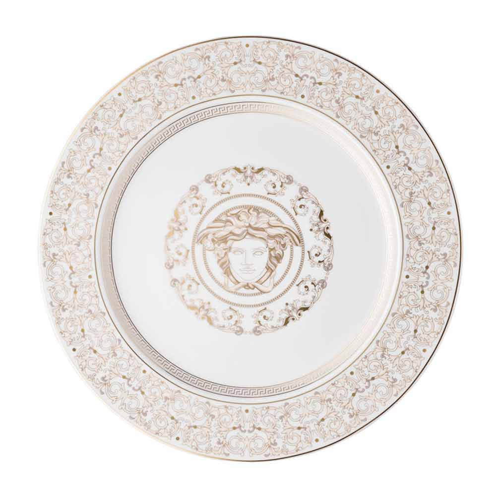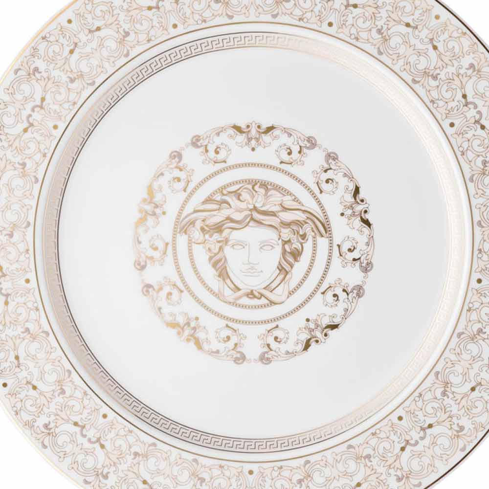 Assiette marque-place en porcelaine Medusa Gala Design de Rosenthal Versace La fabuleuse assiette porte-cartes de 30 cm de Versace fait partie de la collection de table raffinée et luxueuse Medusa Gala. Inspirée par l'opulence et l'atmosphère unique des dîners de gala, Medusa Gala réinterprète les motifs traditionnels de Versace dans le design et la décoration : la représentation iconique de la Méduse alterne avec des ornements baroques raffinés dans un précieux filigrane d'or. Un effet de contraste passionnant entre la blancheur de la porcelaine et l'or pur donne vie à une mise en place parfaite, moderne et en même temps unique. Enrichie de motifs et de décorations entièrement en or, Medusa Gala se décline dans une version « Gold » encore plus luxueuse, parfaite pour intégrer et embellir davantage la table.