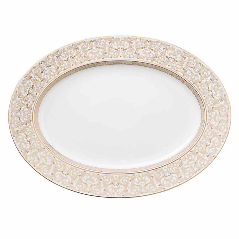 Assiette ovale Medusa Gala 40 cm en porcelaine design Rosenthal Versace L'assiette ovale 40,5x30 cm de Versace fait partie de la collection de table raffinée et luxueuse Medusa Gala. Inspirée par l'opulence et l'atmosphère unique des dîners de gala, Medusa Gala réinterprète les motifs traditionnels de Versace dans le design et la décoration : la représentation iconique de la Méduse alterne avec des ornements baroques raffinés dans un précieux filigrane d'or. Un effet de contraste passionnant entre la blancheur de la porcelaine et l'or pur donne vie à une mise en place parfaite, moderne et en même temps unique. Enrichie de motifs et de décorations entièrement en or, Medusa Gala se décline dans une version « Gold » encore plus luxueuse, parfaite pour intégrer et embellir davantage la table.