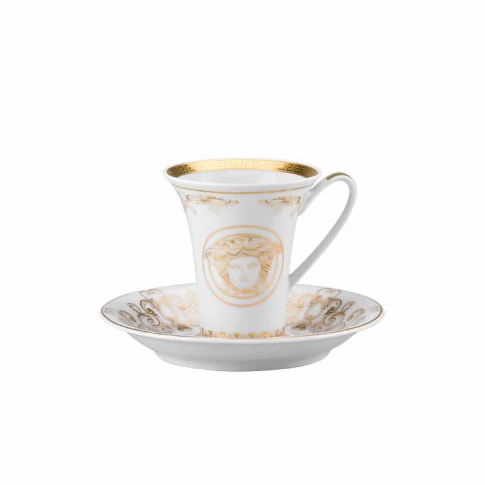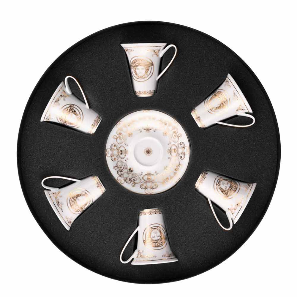 Ensemble de 6 tasses à expresso en porcelaine Medusa Gala Gold de Versace Dans cet ensemble de 6 tassesOn y retrouve tout le raffinement et le luxe de la nouvelle collection de vaisselle Medusa Gala , qui réinterprète les motifs traditionnels de Versace dans le design et la décoration : l'icône représentant la Méduse alterne avec des ornements baroques raffinés dans un précieux filigrane d'or. Un effet passionnant de contrastes entre la candeur de la porcelaine et l'or pur donne vie à une mise en place parfaite, moderne et en même temps singulière. Enrichie de motifs et de décorations entièrement en or, Medusa Gala existe également dans la version « Gold » encore plus luxueuse, parfaite pour intégrer et embellir davantage la table.