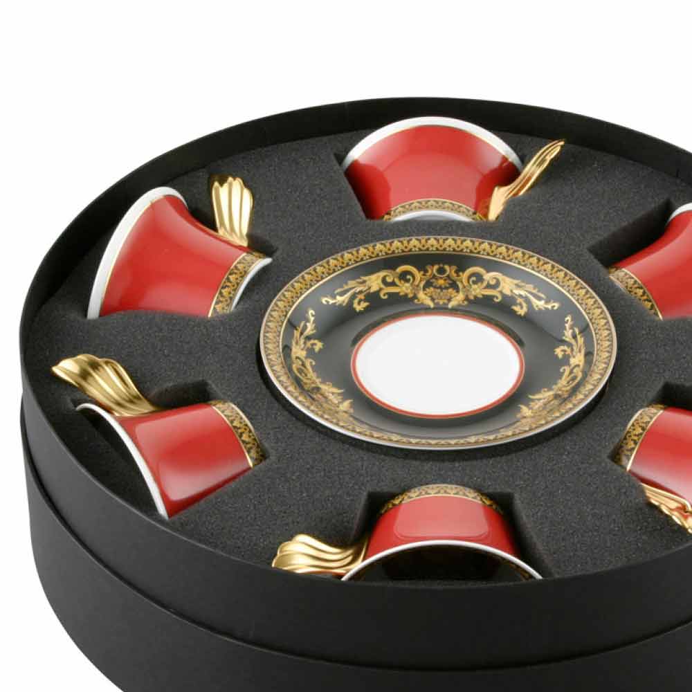 Ensemble de 6 tasses à thé en porcelaine rouge Medusa de Versace Le service de six tasses fait partie de la ligne Medusa Rosso , caractérisée par trois nuances de couleurs prédominantes : un rouge élégant et les très prisés or et noir ; qui, une fois combinés, forment un motif raffiné qui vous transporte dans des époques fascinantes et lointaines. La tête de Méduse est l'icône de la collection Versace , un élément qui donne à la pièce une allure classique, somptueuse et luxueuse.