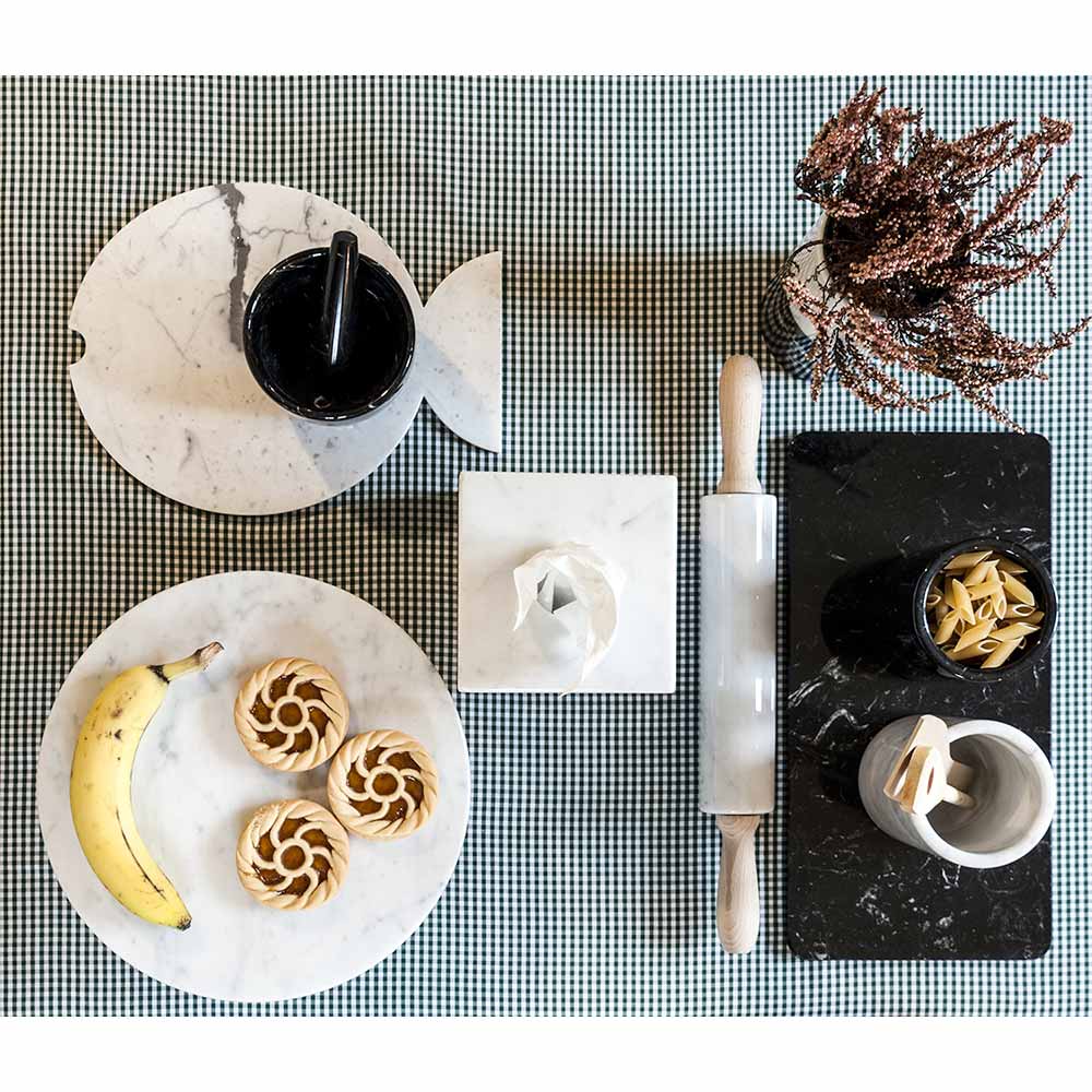 Rouleau à pâtisserie moderne réalisé en 3 variantes de marbre: marbre blanc de Carrare, marbre gris Bardiglio et marbre Paonazzo. Le marbre utilisé est précieux et de grandequalité . C'est une pièce unique car chaque bloc de marbre utilisé diffère des autres pour les veines et les nuances. Le marbre blanc de Carrare utilisé pour la création de ces produits provient de la carrière Poggio Silvestre, source de marbre de première qualité classée depuis le siècle dernier. Mamo Bardiglio, en revanche, a une base grise compacte et des stries blanches. Le marbre Paonazzo , une variété de marbre fin typique de la tradition italienne, se caractérise par un fond blanc beurre avec des veines allant du bleu intense à l'orange.