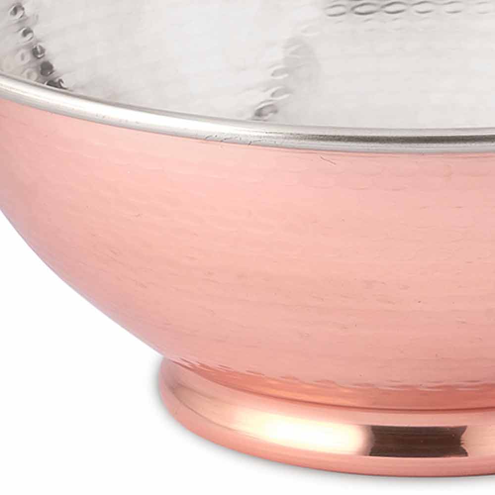 Saladier rond en cuivre poli martelé de conception artisanale fabriqué en Italie.