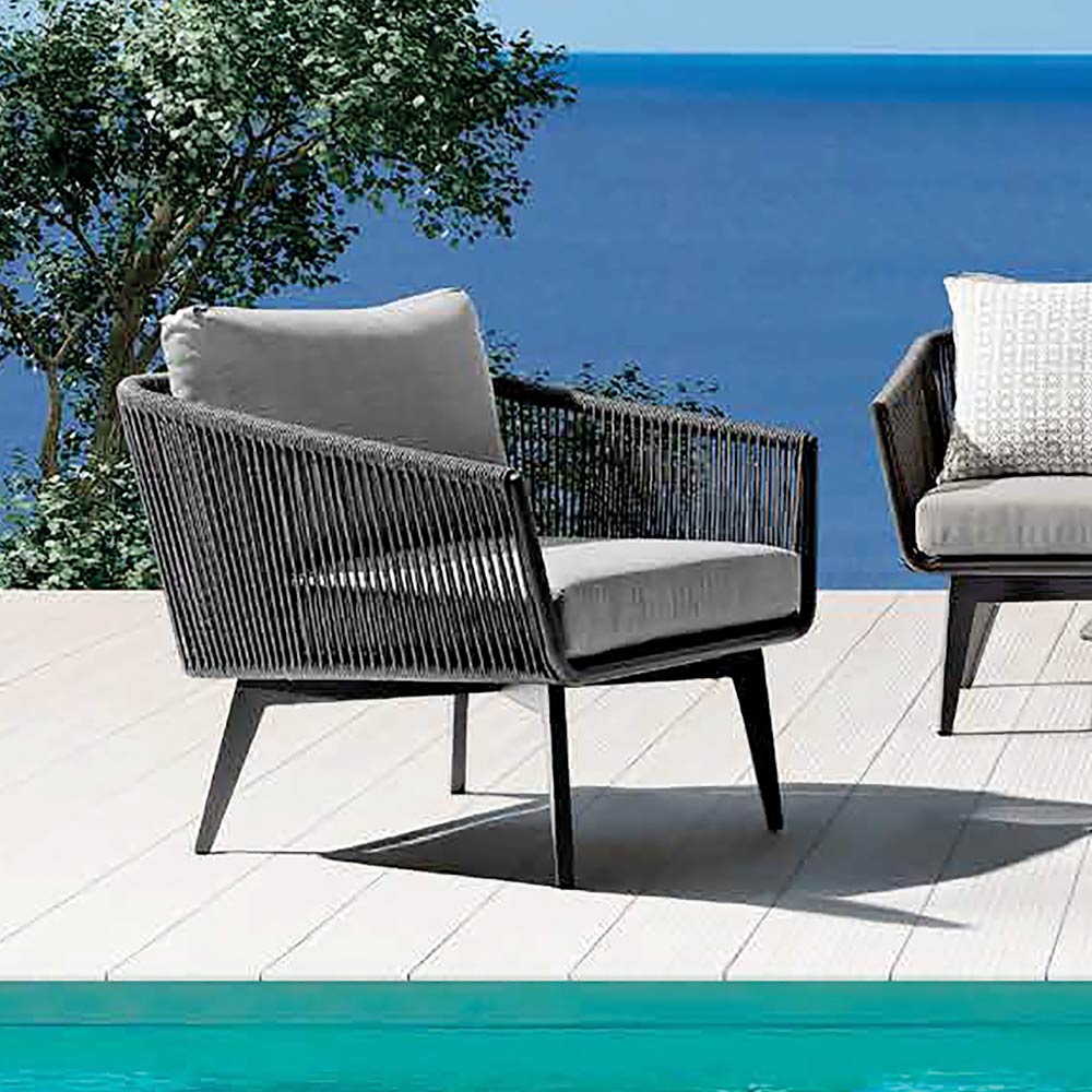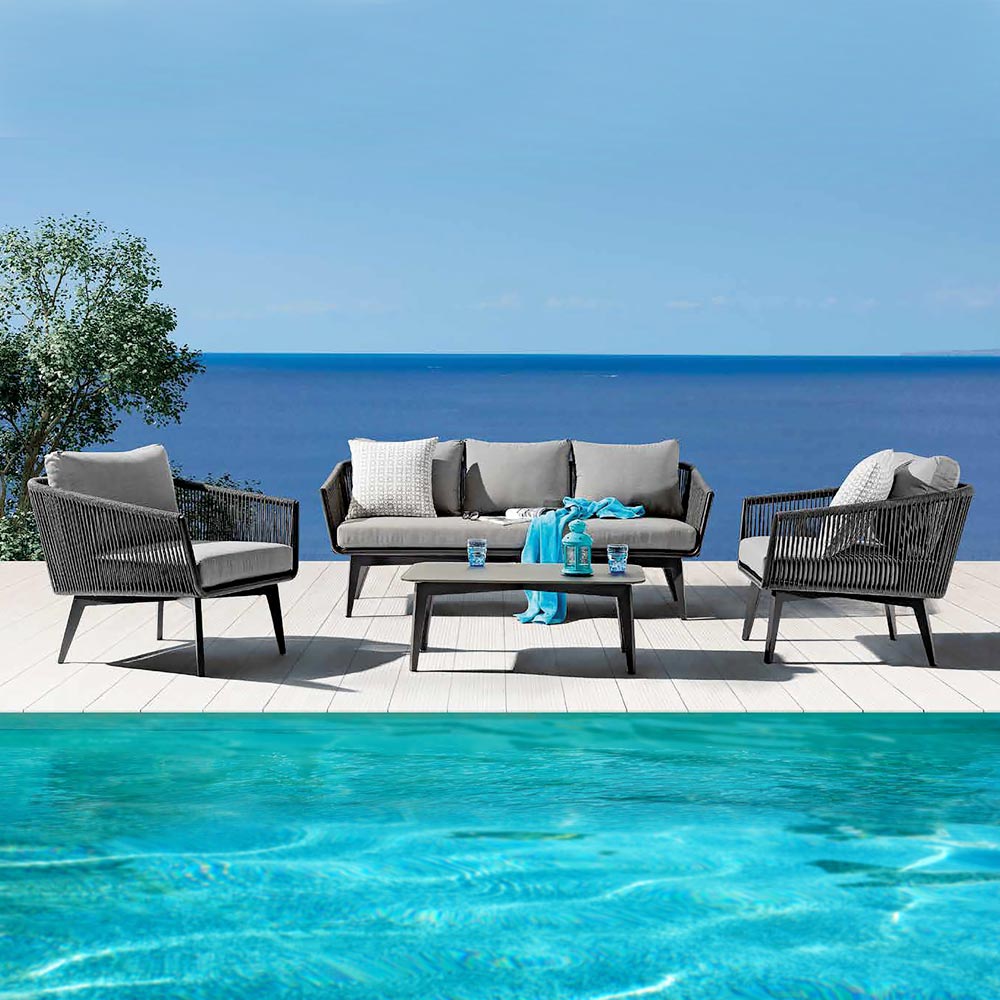 Ce salon de jardin est un parfait exemple d' élégance contemporaine, conçu pour vivre en extérieur avec style et confort absolu . Sa structure en aluminium peint , solide et légère, dessine des lignes modernes et raffinées, tandis que le tressage latéral en corde apporte mouvement et légèreté visuelle, rendant l'ensemble sophistiqué et accueillant.