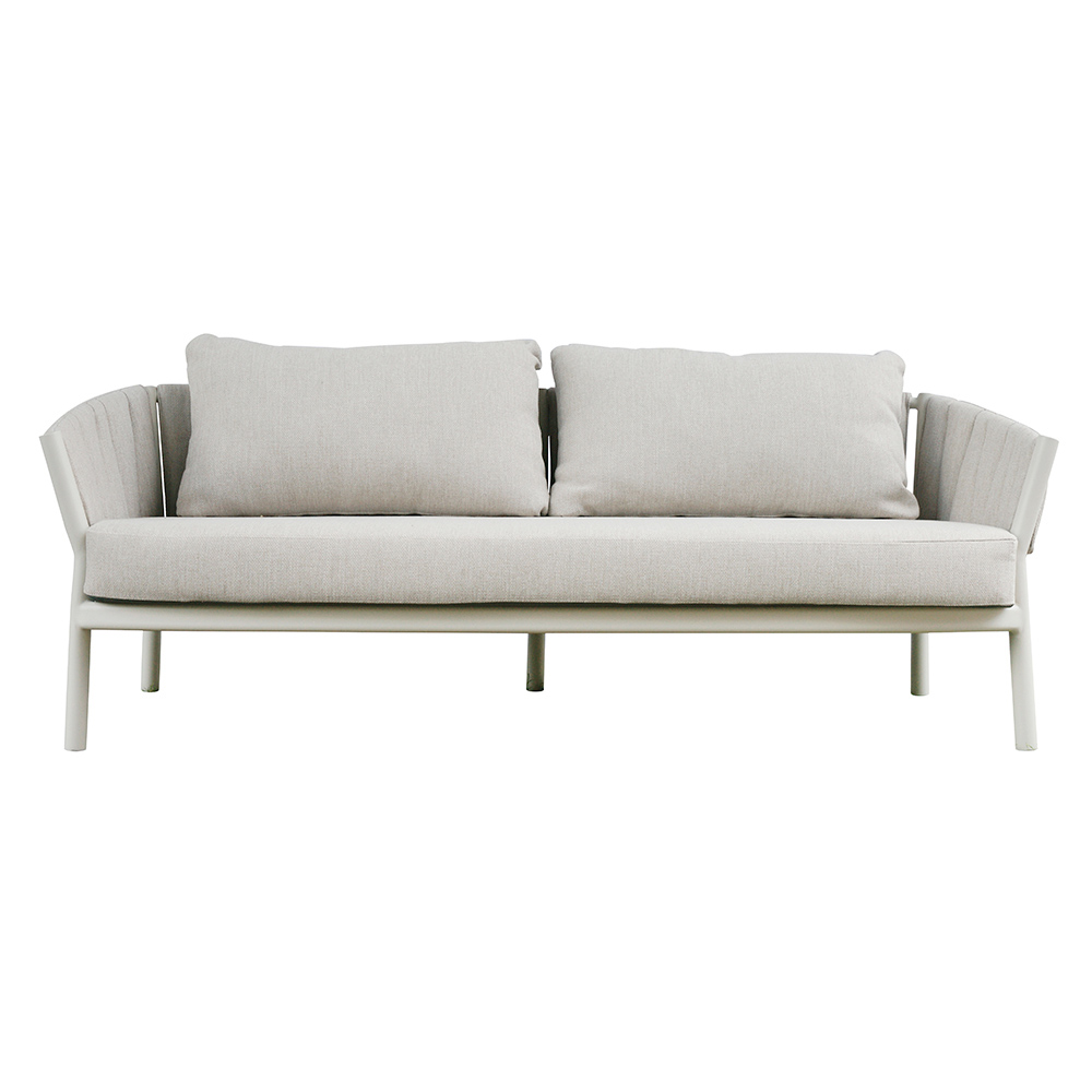 1 canapé : structure en aluminium blanc, dossier et accoudoirs en aluminium avec rembourrage gris, coussins en tissu gris amovibles.