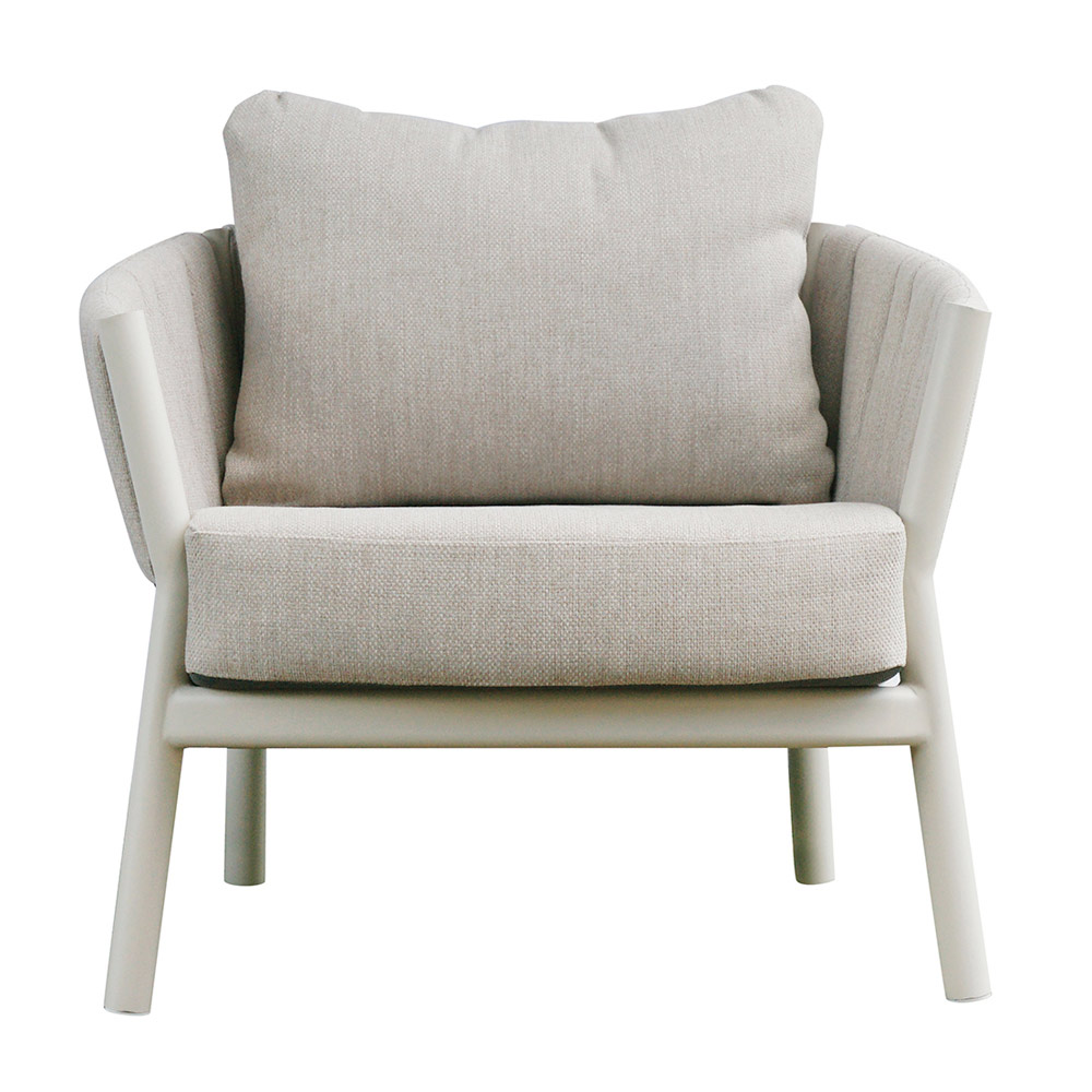 2 fauteuils : structure en aluminium blanc, dossier et accoudoirs en aluminium avec rembourrage gris, coussins avec housses amovibles en tissu gris.