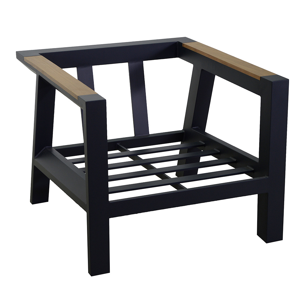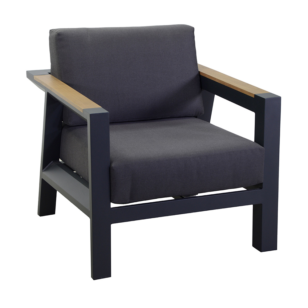 2 fauteuils : châssis en aluminium antirouille peint par poudrage en anthracite, coussins hydrofuges en polyester gris foncé, housses et accoudoirs amovibles en bois TEAK du Brésil