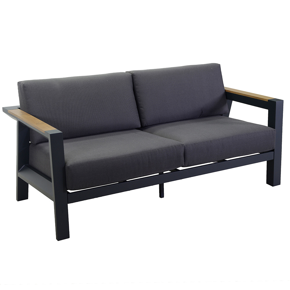 1 canapé : structure en aluminium thermolaqué antirouille anthracite, coussins déperlants en polyester gris foncé, housses et accoudoirs déhoussables en bois TEAK du Brésil
