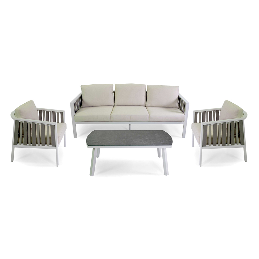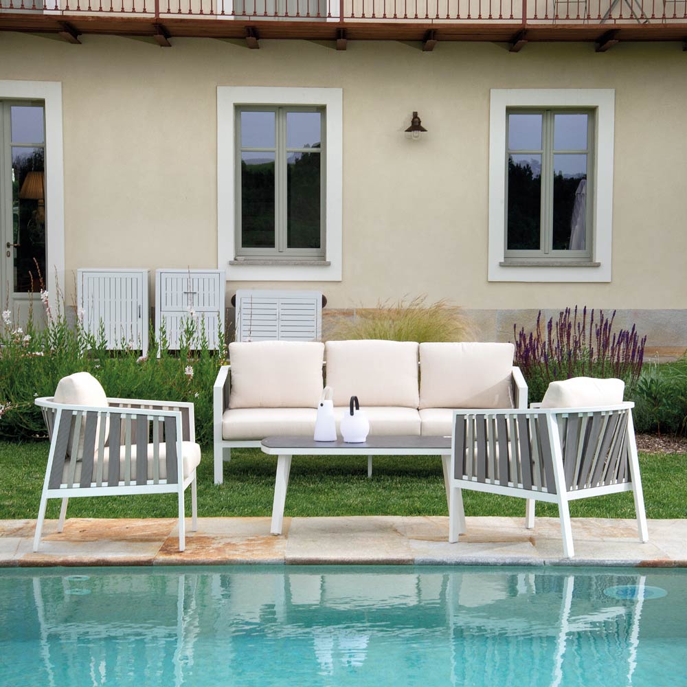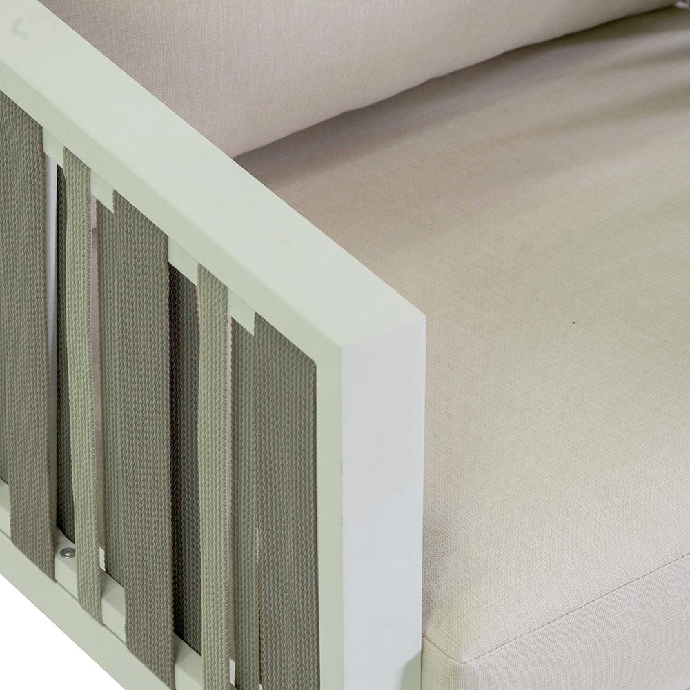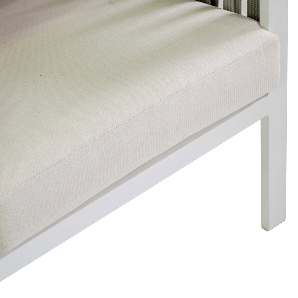 1 canapé : châssis en aluminium antirouille peint par poudrage en blanc, cordes en polyester bicolore beige et gris tourterelle, coussins hydrofuges en oléfine couleur crème, épaisseur 10 cm