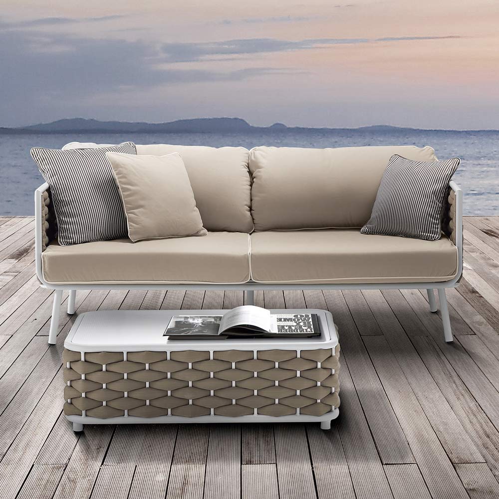 blanc laqué aluminium et par le tissage fait à la main réalisé avec un tube de tissu Olefin, un matériau spécifique pour l'extérieur, rembourré avec du polyuréthane. Les