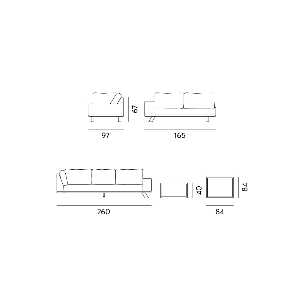 canapé trois places : L 260 x P 97 x H 67 cm ;