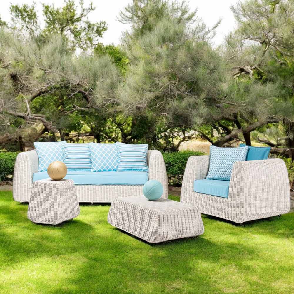 Salon d'extérieur en polyrotin et coussins bleus - Charlie