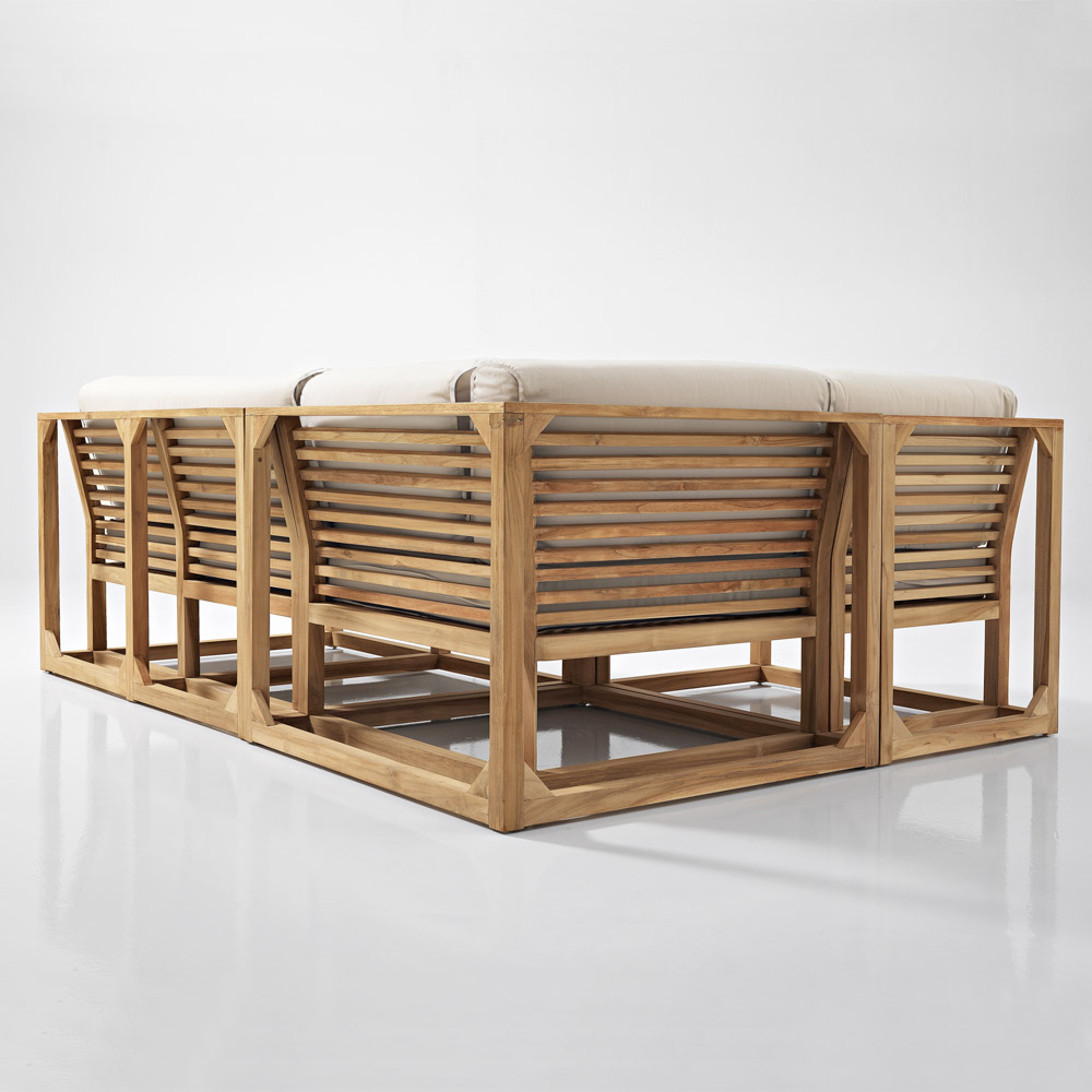 Les coussins offrent un confort inégalé, invitant à des moments prolongés de détente et de contemplation. L'agencement modulaire offre une flexibilité unique, permettant d'adapter l'aménagement aux besoins du moment, qu'il s'agisse d'une rencontre sociale ou d'un après-midi de pure détente.