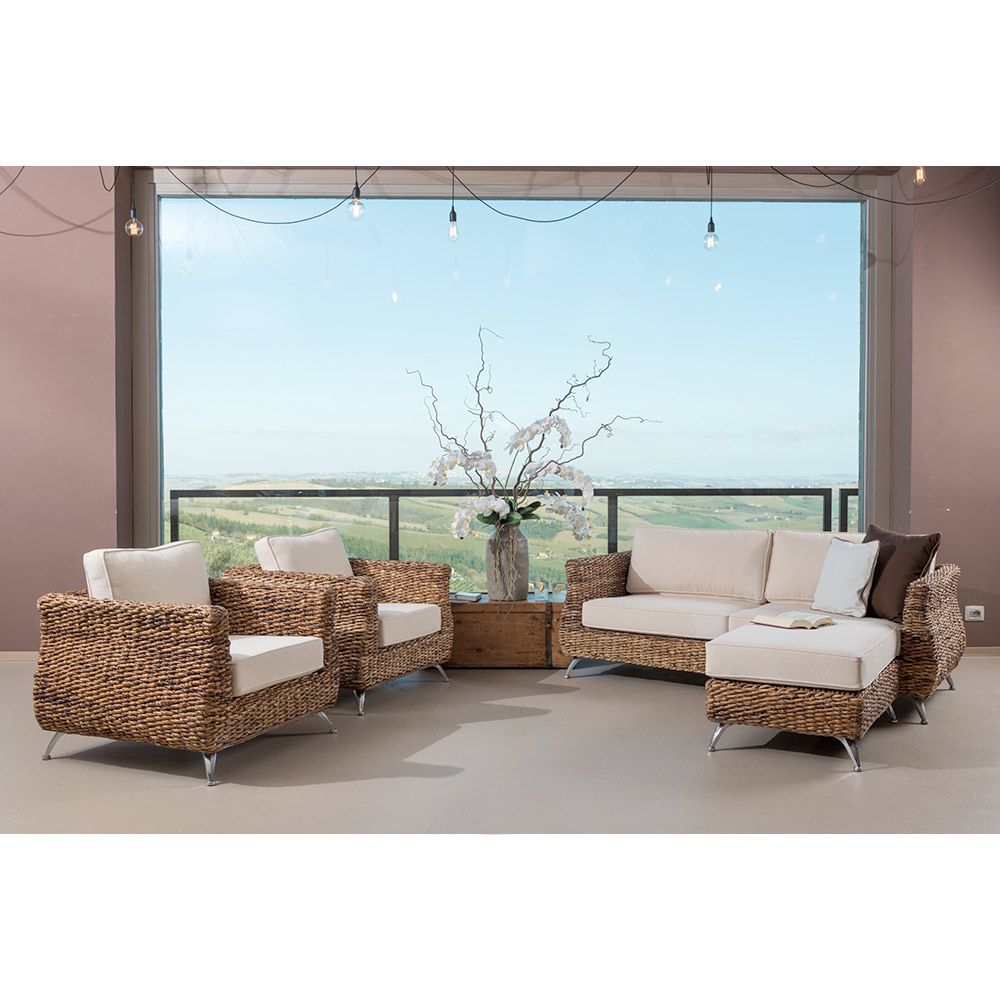 Le salon appartient à toute une collection qui se distingue par ses tonalités modernes tant dans le design des sièges que dans le détail des pieds en aluminium . En même temps, cependant, il est animé par la chaleur du tissage naturel , fait à la main en utilisant un tressage raffiné de banane naturelle. Les produits de cette collection sont adaptés à l'ameublement des espaces extérieurs abrités tels que les porches, les balcons, les terrasses, les vérandas et les gazebos, en animant les environnements avec une chaleur et un style uniques. Ils conviennent également à tout environnement intérieur